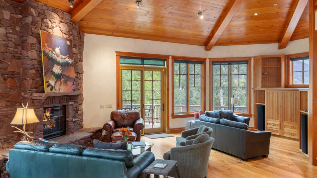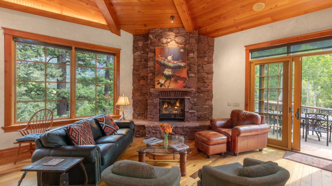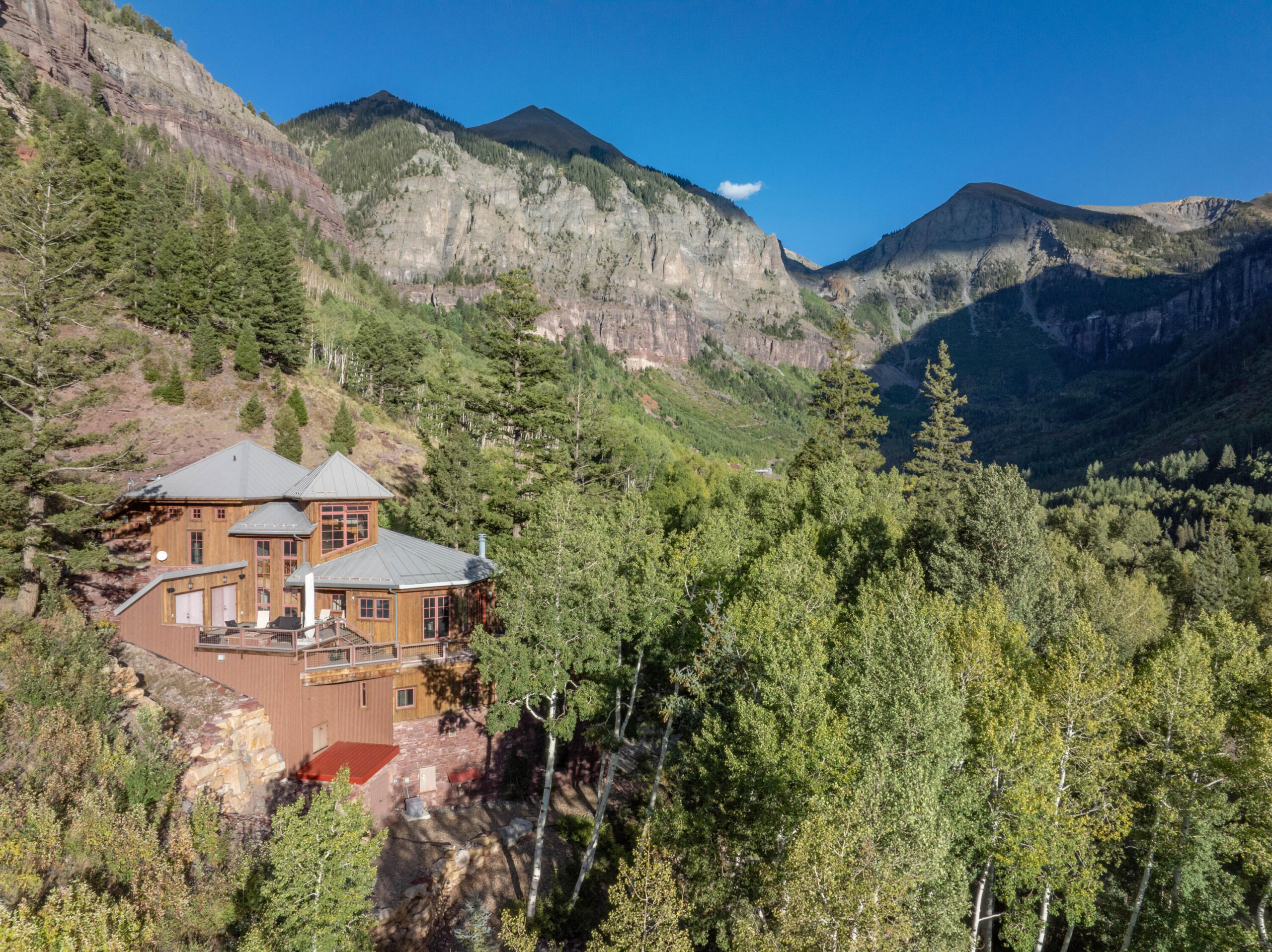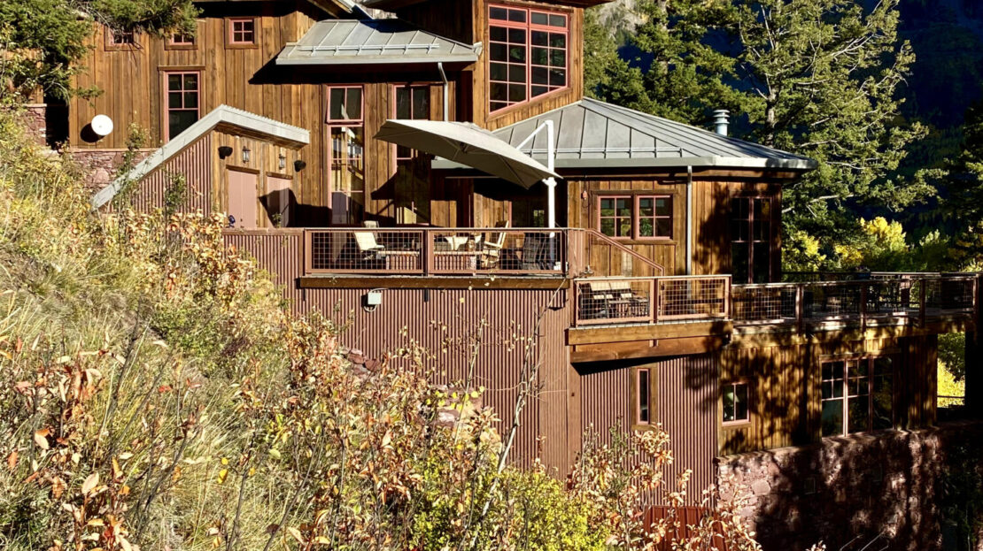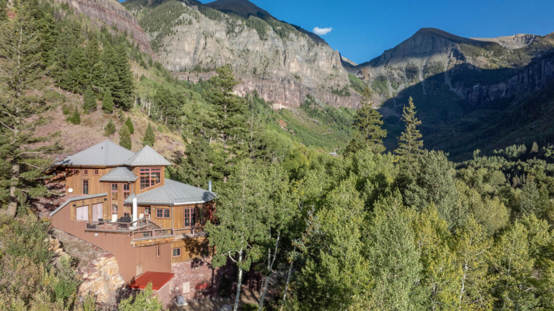 A product of years of design work and careful craftsmanship, Dream Catcher is one of the most unique residences in the Telluride Valley. Built into sandstone cliffs and set on two lots with just under five total acres, the house tumbles down the mountainside following the path of the private waterfall directly to its east. Designed as a retreat that brings the outside in, the home offers unique and beautifully framed views of Telluride’s valley from every room and was built with recycled lumber native rock taken from the site. Wrapped by over 2000 sq. ft. of open decks with a spacious living area, the property is perfect for entertaining. Guests have views east to Bridal Veil, Ingram and several other seasonal waterfalls and west over Telluride. Evenings can be spent enjoying the alp