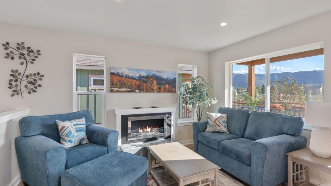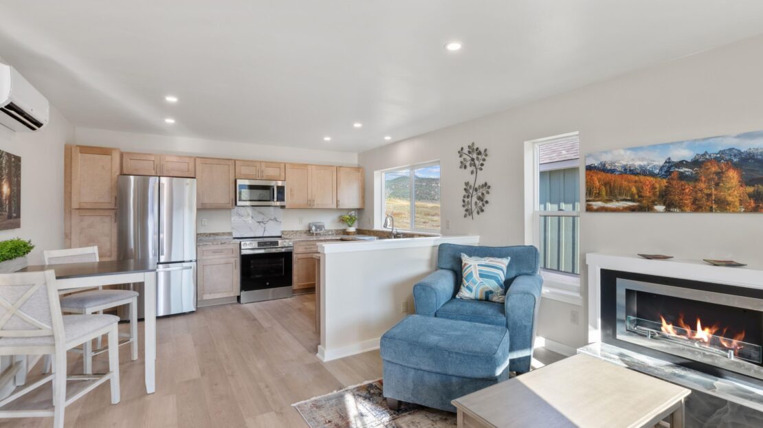 Home is complete and offered furnished.This project is well designed to be a friendly neighborhood atmosphere. The designer,Joe Nelson, has created user friendly homes that are layed out with care so the rooms are very useable and attractive. Each house has a front porch with views of the mountains. Designated outdoor parking spots and storage for each house. Different paint colors on the exterior gives the house a village feel.