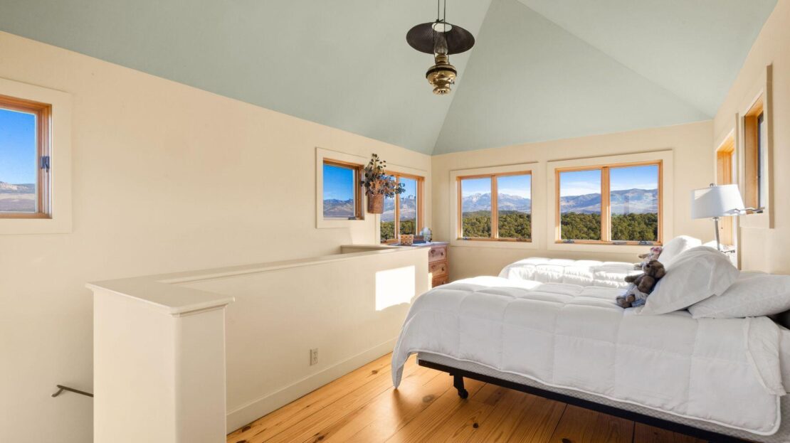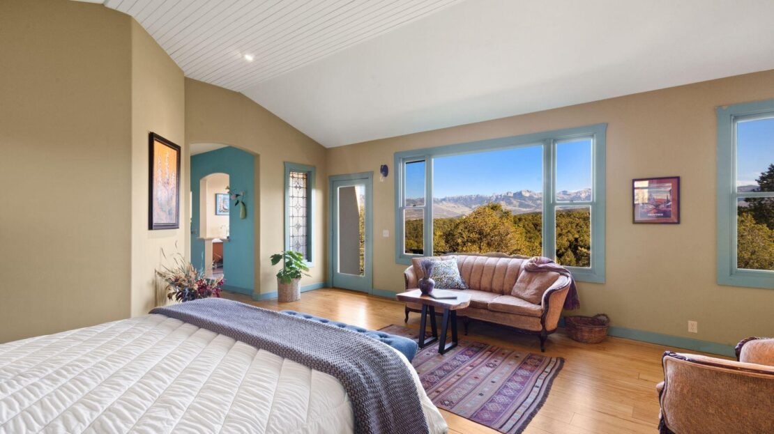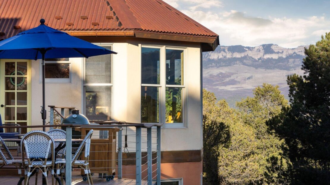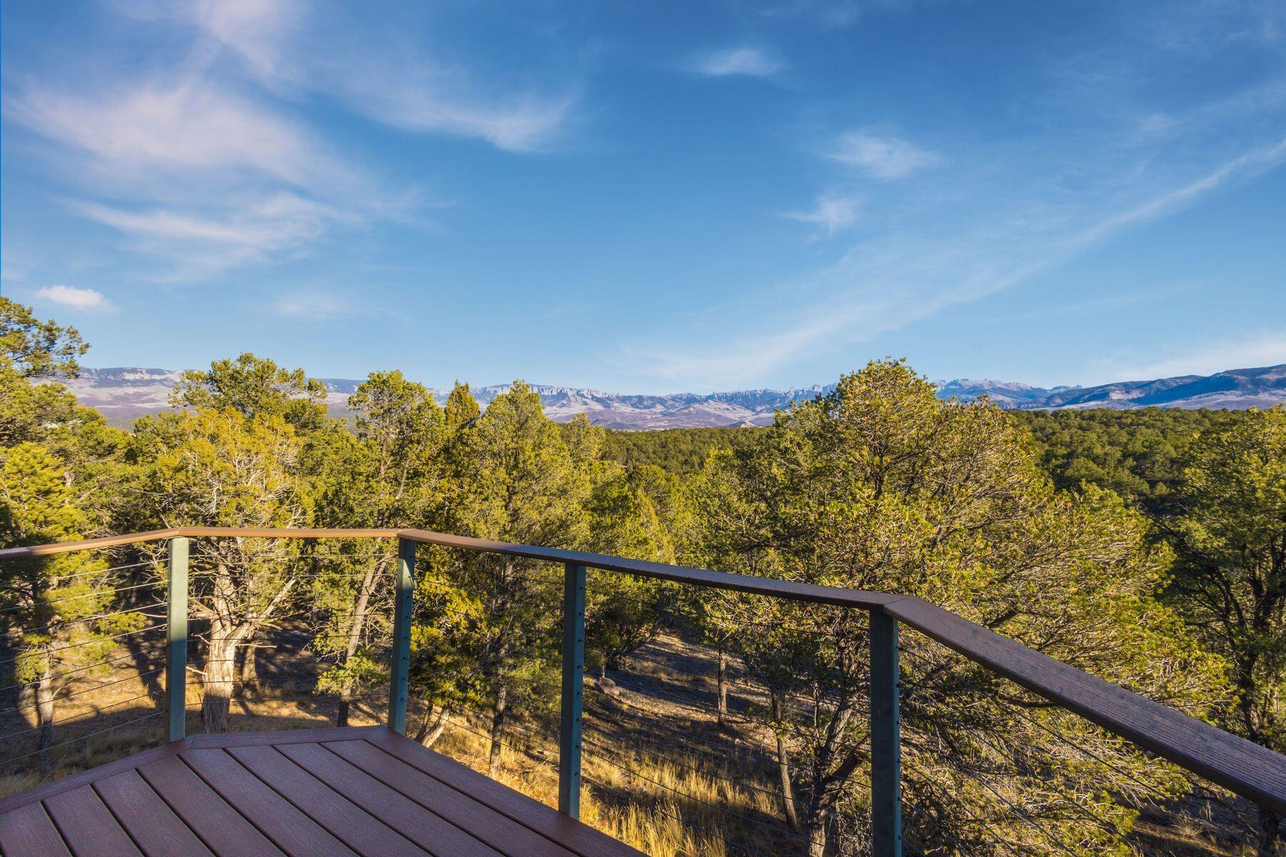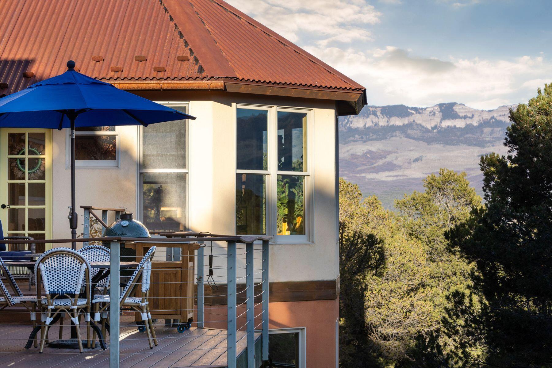 Private Loghill Mesa retreat on 4+ secluded acres with uninterrupted views of Mount Sneffels and the Cimarron Range from most every room and two income generating quarters. The 4,840 sq ft custom main home features 3 bedrooms plus flex spaces, vaulted ceilings, a two-sided wood-burning fireplace, a European-style kitchen with walk-in pantry, and heated wood floors. The main-level primary suite enjoys panoramic views, dual closets, and a spa-like bath. The lower level includes a private suite with full kitchen, bedroom, bath, and parking, plus an additional guest suite. A separate income-producing guest house sits above a two-car garage. With close proximity to Divide Ranch & Club, this serene property offers unmatched privacy, views and access to skiing, hiking, and nearby hot springs.